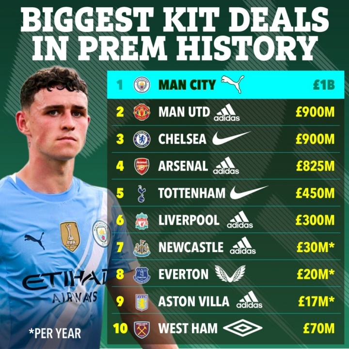 曼城的合同也超过了曼联与阿迪达斯签订的10年9亿英镑合同、皇马与阿迪达斯签订的8年9.5亿英镑合同,成为足球史上最大的球衣赞助合同。