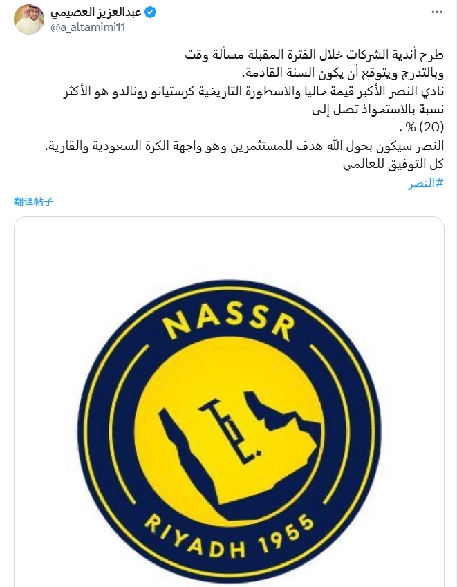 24直播网08月01日讯 沙特记者عبدالعزيز العصيمي报道,C罗现在拥有利雅得胜利20%股权。记者表示,未来一段时间企业俱乐部的推出只是时间问题,正在逐步进行,预计将...